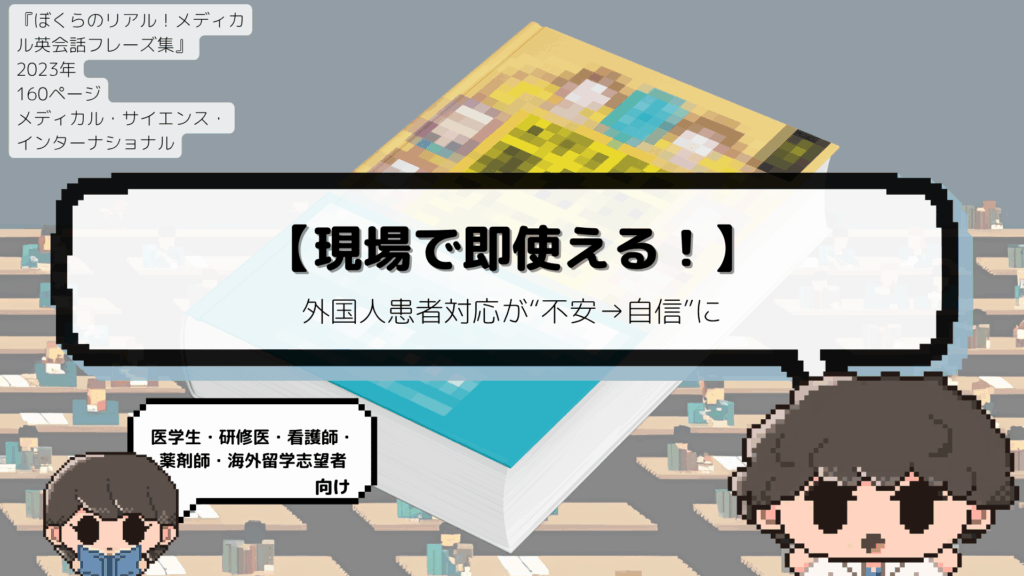 【現場で即使える!】「ぼくらのリアル!メディカル英会話フレーズ集」〜外国人患者対応に自信がもてる“生きた医学英語”を読む・聴く・すぐ使う。 観光客・在留者・留学生…英語対応の需要は年々増加。『ぼくらのリアル!メディカル英会話フレーズ集』は✅ 北米臨床で毎日…