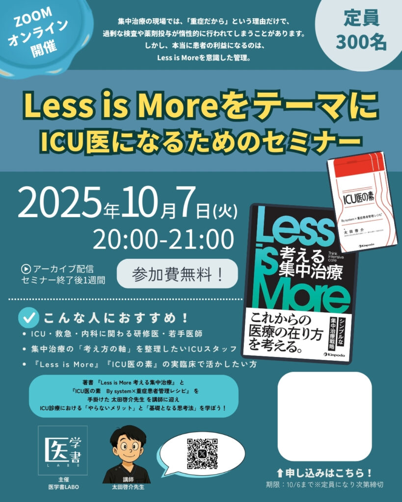 10月7日(火)20:00より、『Less is Moreをテーマに学ぶ、ICU医になるためのセミナー』をオンライン(Zoom)で開催します。