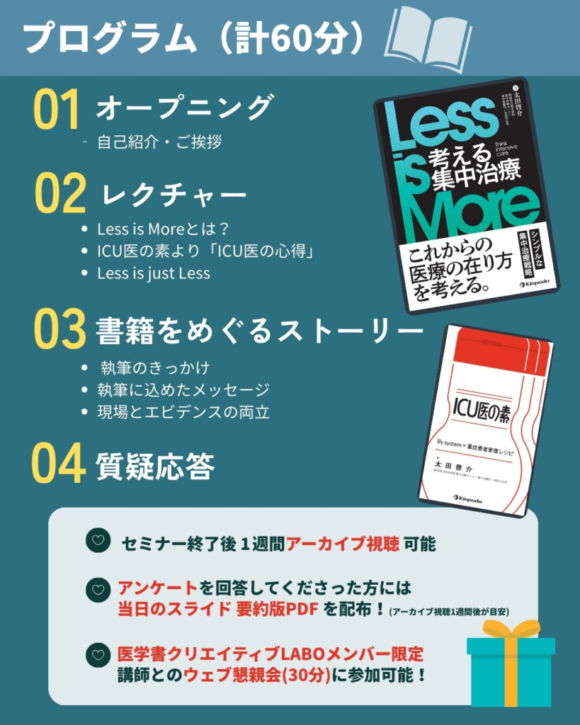 - 医学書クリエイティブLABOメンバー限定:本編終了後30分のウェブ懇親会に参加可能!