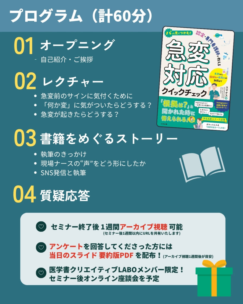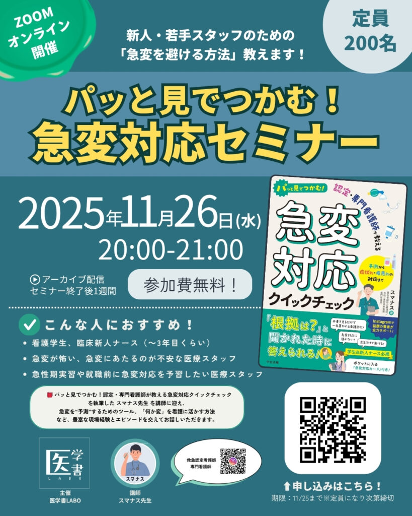 著書『パッと見でつかむ!認定・専門看護師が教える急変対応クイックチェック』の要点を60分でギュッと解説。