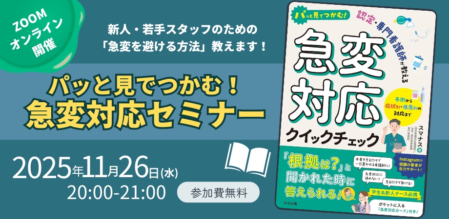 パッと見でつかむ!急変対応セミナー【無料オンライン・アーカイブ視聴あり】11月26日(水)20:00より、『パッと見でつかむ!急変対応セミナー』をオンライン(Zoom)で開催します。 新人・若手スタッフのための「急変を避ける方法」教…
